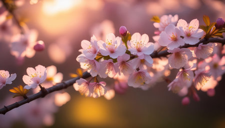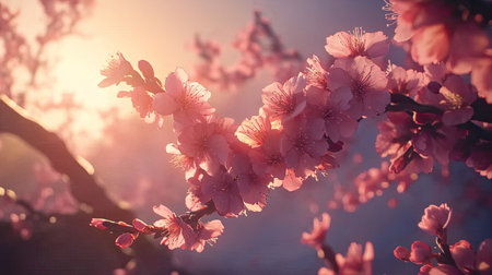 A close-up shot showcases the delicate beauty of cherry blossoms in full bloom, their soft pink petals illuminated against a blurred, atmospheric backdrop.