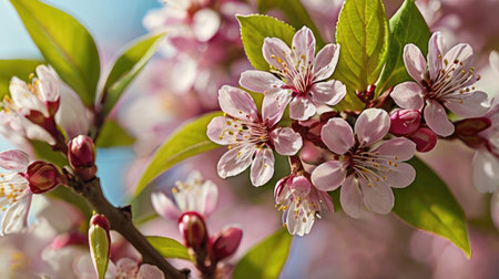 Close-up of cherry blossom on a branch, springtime nature. Delicate beauty and renewal concept