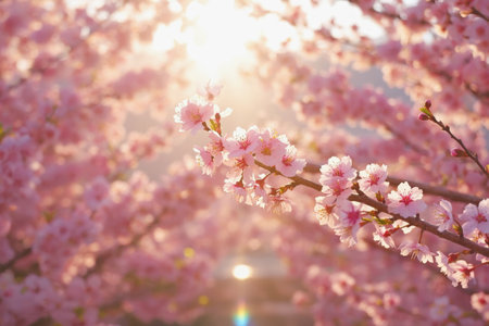 Captivating view of cherry blossoms in full bloom with soft morning light softly illuminating the delicate pink flowers. A serene spring scene.
