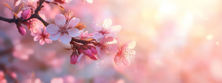 Cherry blossoming in the sunshine. Spring and tranquil nature concept. Toned image. Horizontal, wide screen banner format