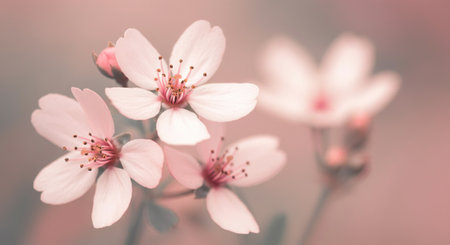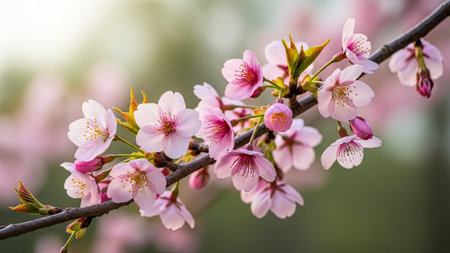 This image showcases delicate pink cherry blossom blooms set against a softly blurred background, creating a serene and harmonious floral scene perfect for seasonal themes.
