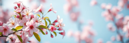 A tranquil gradient background blends softly with the blooming pink cherry blossoms, creating a peaceful atmosphere. This springtime moment captures nature's beauty.