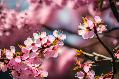 Cherry blossoms burst into bloom, draping delicate pink flowers across the branches. The vibrant display against the bright blue sky captures the essence of spring's beauty and renewal.