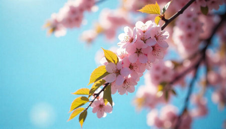 Delicate pink cherry blossoms bloom against a bright blue sky, creating a tranquil and vibrant scene that embodies the beauty of springtime nature.