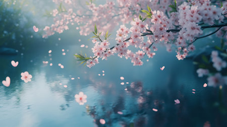 A delicate branch of pink cherry blossoms, or sakura, blooms against a soft, pastel-colored background. The image captures the essence of spring and renewal, with falling petals adding a touch of movement and ephemeral beauty.