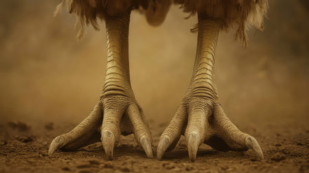A stunning close-up view of a bird's feet, showcasing intricate scales and powerful claws gripping the dry ground, perfectly capturing wildlife's beauty.