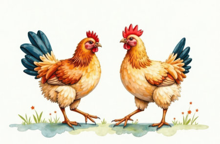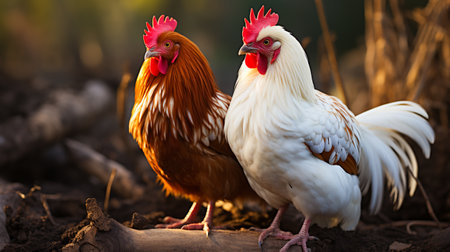 A lively farmyard scene captures a majestic rooster and a hen walking gracefully on the ground, showcasing their colorful plumage and rural charm.