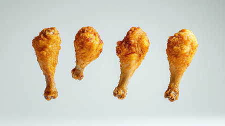 Vibrant display of beautifully fried chicken legs suspended in mid air, showcasing crispy texture and delicious appeal perfect for culinary presentations.