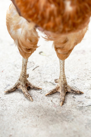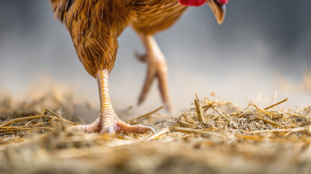Close-up of rooster feet walking on dry straw with dust and feathers in the frame