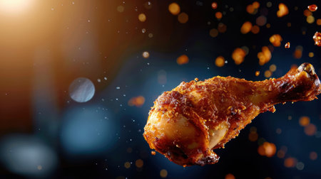 A captivating image showcasing a crispy fried chicken drumstick surrounded by flying spice particles, set against a dark and moody background.