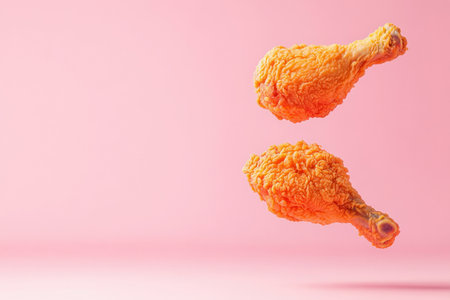 Two golden fried chicken drumsticks floating against a soft pink background, showcasing a delicious and appetizing appearance.