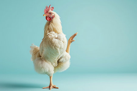 Detailed full-body shot of a white chicken, standing tall with soft feather textures clearly visible.