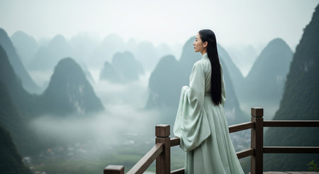 Young woman traditional wearing green hanfu dress standing on balcony with mountain view, enjoying peaceful nature scenery fog.