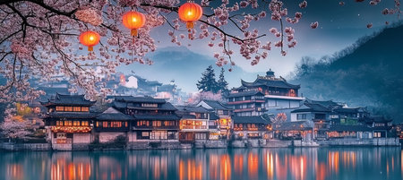 Lakeside view with oriental architecture, cherry blossoms, and red lanterns for a serene atmosphere.