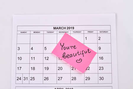 March calendar and sticker note with you are beautiful handwriting. Top view flat lay.