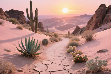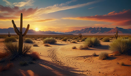 Scenic desert trail at golden sunset, surrounded by tall cacti, cracked dry soil, desert flora, and rocky formations. Ideal for travel, nature, and arid landscape themes.