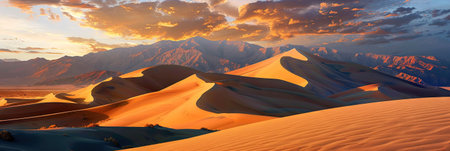 Stunning Desert Landscape at Golden Hour Featuring Curvy Dunes and Majestic Rocky Peaks Under Clouds