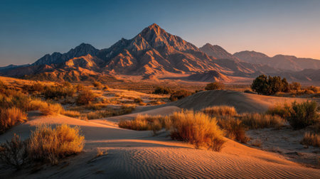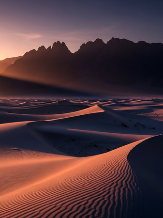 This breathtaking desert landscape captures rolling sand dunes and distant hills bathed in warm hues at sunset, creating a peaceful atmosphere ideal for relaxation.