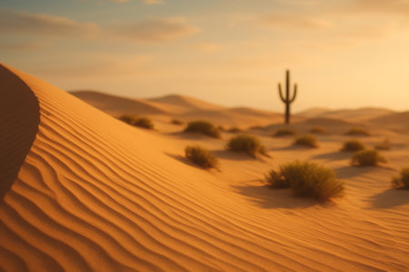 Soft sand dunes ripple under a golden warm light while a solitary cactus stands tall, surrounded by sparse vegetation in a serene desert setting.