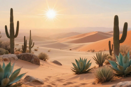Peaceful desert scene at sunrise featuring tall saguaro cacti, agave plants, rocks, and soft sand dunes glowing in golden morning light. Ideal for nature, travel, and landscape themes.