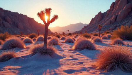 Desert landscape at sunset with Joshua tree and grasses