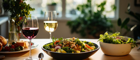 A plate of food with a glass of wine on a table. Scene is elegant and sophisticated