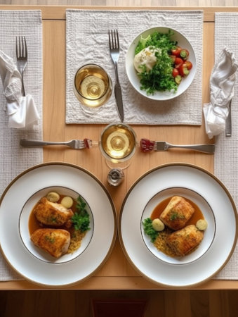 Elegant luxury dining with gourmet cuisine and wine in a cozy restaurant. Culinary delight captured in ambient lighting. Food catering and English cuisine