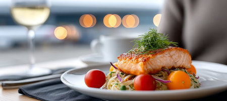 Exquisite Gourmet Meal at Airport Lounge Featuring Salmon, Fine Wine, and Luxurious Ambiance