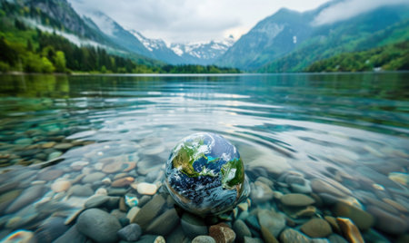 Earth in mountain lake; serene, realistic scene; digital art; environmental awareness; education; stock photo