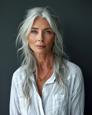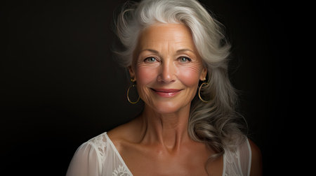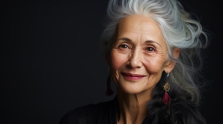 This image features a smiling mature woman with long, gray hair and stylish ear accessories, capturing a sense of confidence and serenity in a neutral studio setting.