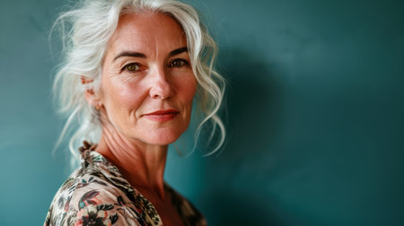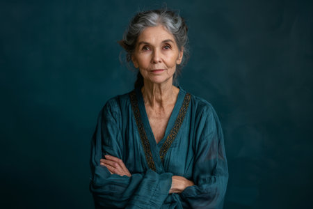 A confident older woman with silver hair stares directly at the camera She wears a teal blouse and has her arms crossed in front of her The background is a deep teal She has a serious, calm expression AI Generative