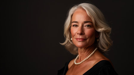 Elegant woman with silver hair wearing black dress and pearl necklace, exuding confidence and grace against dark background