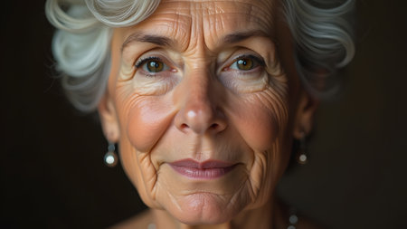 A portrait of a mature woman with well-maintained skin, highlighting her glowing complexion and graceful aging, with minimal makeup and a serene expression.