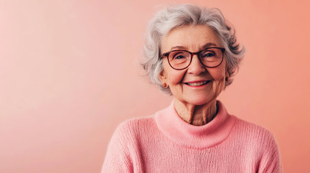 Warm and radiant elderly woman with a joyful smile against a soft pink background, exuding wisdom and grace. Perfect for conveying warmth and positivity. Generated A.I.