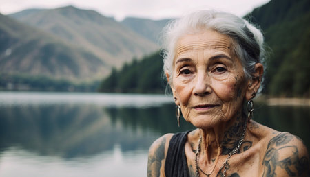 Portrait of trendy old woman with tattoo sitting on a lake, calm and beautiful female lady wear vintage accessories outdoor, smiling tattooed senior and peaceful nature