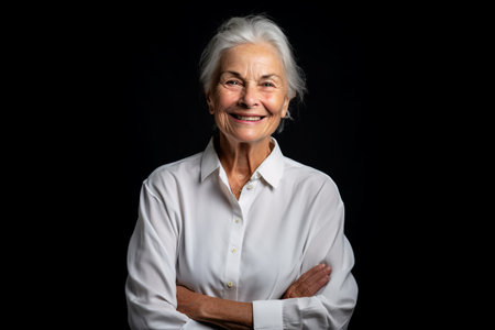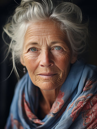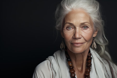 Portrait of a graceful elderly woman with silver hair and striking features against a dark background