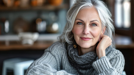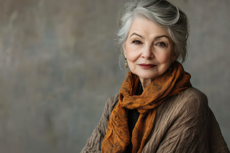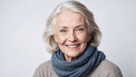 A mature woman with elegant silver hair smiles warmly while wearing a cozy scarf and dark sweater. The neutral background highlights her natural beauty and confidence, evoking a sense of calm.