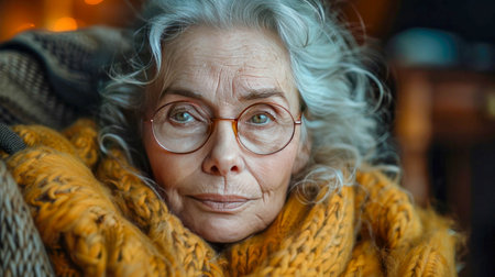 A thoughtful elderly woman adorned with vibrant glasses sits silently, her expression reflecting deep contemplation in a softly lit, cozy space.