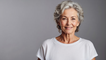 Beautiful mature woman with light gray background in a white t-shirt, studio shot