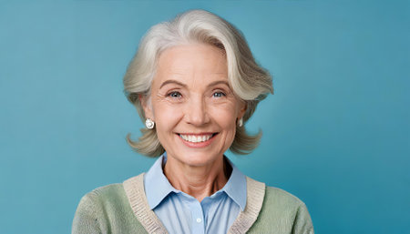 A heartwarming image of a happy senior woman smiling confidently at the camera. The blue background enhances her radiant expression, showcasing positivity and grace in a vibrant, professional