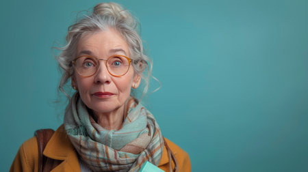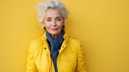 A senior woman with short gray hair and glasses looks directly at the camera, standing against a bright yellow background AI Generative