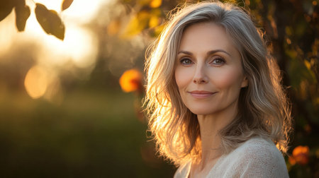 A portrait of a mature woman with smooth, radiant skin, wearing minimal makeup, and highlighting natural beauty and confidence in a relaxed, outdoor setting