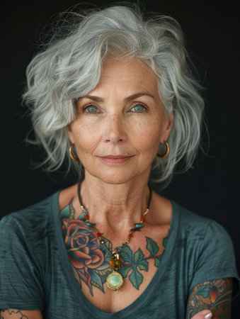 Aging with ink: elderly woman proudly poses with tattoo, showing timeless style and individuality, challenging stereotypes and embracing personal expression through body art.