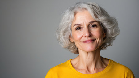 Close up of mature woman with white skin, grey short hair, wavy hair and a clear yellow t shirt, isolated in a light grey studio. Portrait person.
