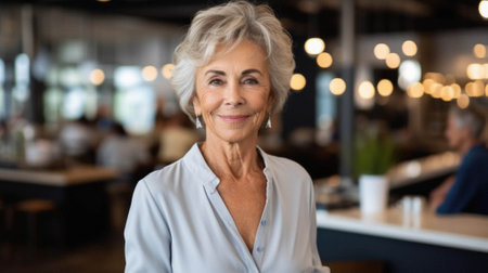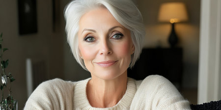 An elegant gray haired woman smiles gently in a chic interior, radiating grace and style.