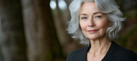 Portrait of a Serene Mature Woman with Silver Hair Smiling Outdoors in a Natural Scenic Setting