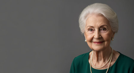 An AI generated illustration of a beautiful, elegant elderly woman's portrait against a gray background