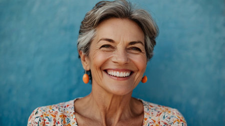 This image captures a joyful senior woman with a bright smile, exuding warmth and positivity. Set against a vivid blue background, the portrait reflects confidence, happiness, and the beauty of