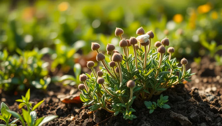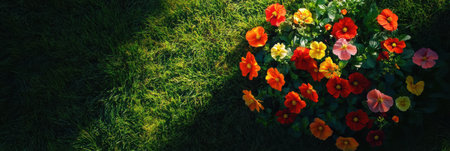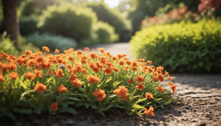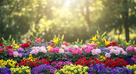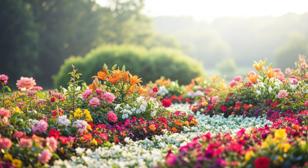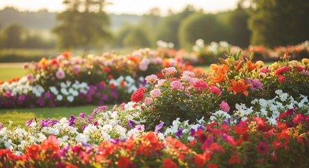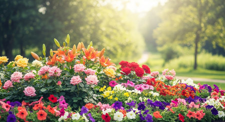 Vibrant flowerbed with colorful blossoms in soft sunlight