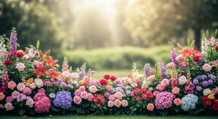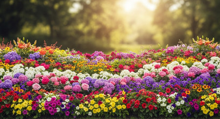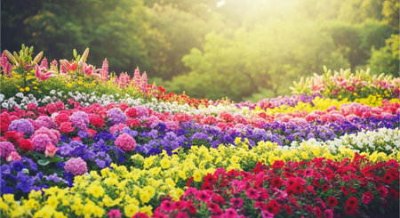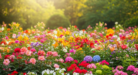 Vibrant flower garden landscape with colorful blossoms in bloom